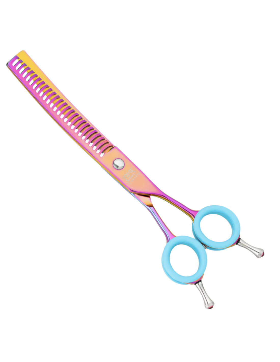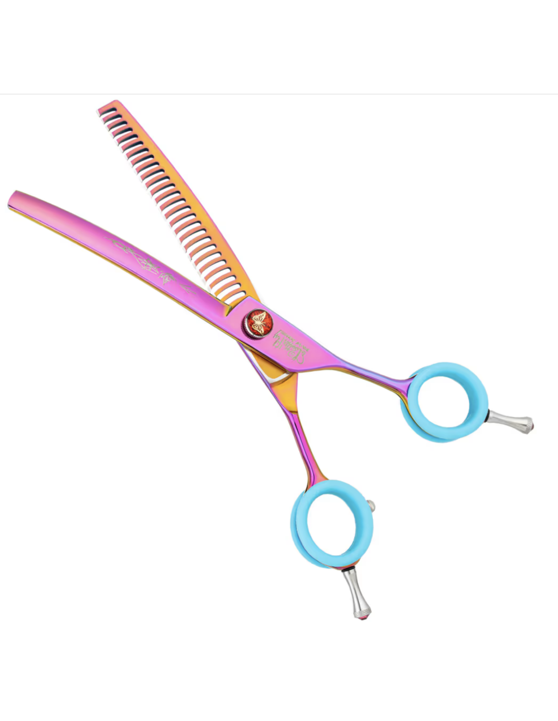 Profesionalne jednostrane zakrivljene škare za stanjivanje, marke Power & Working Scissors, model Butter’Fly. Koriste ih poznati uzgajivači i groomeri širom svijeta, namijenjene su i profesionalcima i za kućnu upotrebu. Njihova oštra rezna površina omogućuje precizno i glatko stanjivanje dlake. Svaki zubac je mikroskopski brušen, što sprječava ispadanje dlake tijekom šišanja. Isporučuju se u etuiju s logom proizvođača.