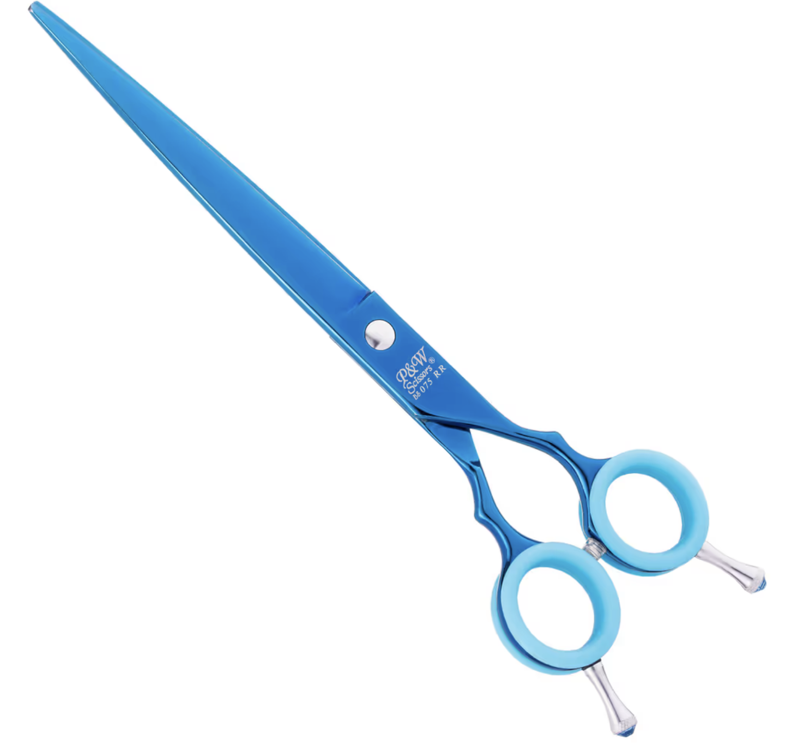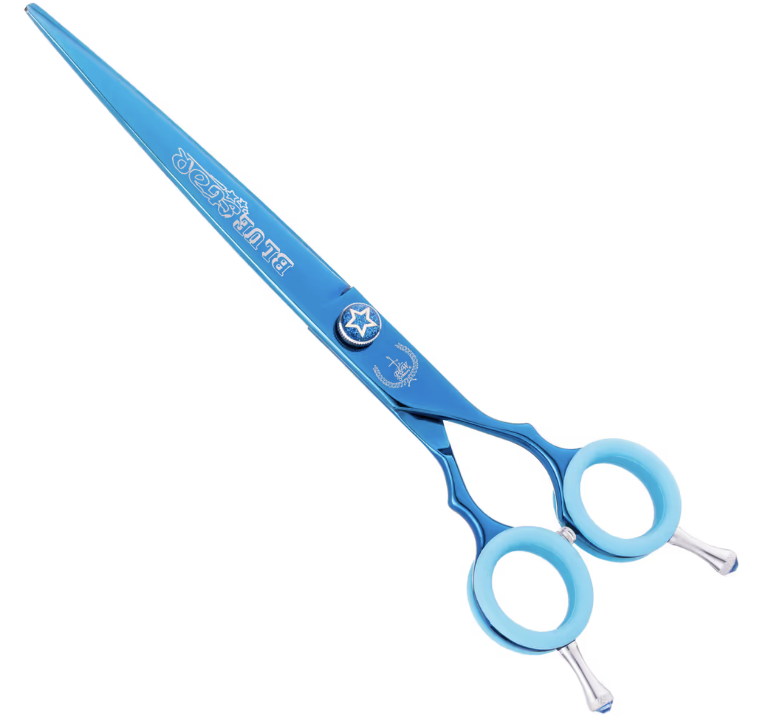 Profesionalne ravne škarje za striženje in oblikovanje dlake,  blagovne znamke Power & Working Scissors, model Blue Star, dolžine 7,5. Uporabljajo jih znani vzreditelji in pasji frizerji ter razstavljavci po vsem svetu, namenjene so tako profesionalcem, kot tudi za domačo uporabo. Njihova ostra rezalna površina omogoča natančno in gladko striženje ter oblikovanje dlake. Vsako rezilo ima mikroskopsko brušeno površino, kar preprečuje zdrs dlake med striženjem. Pakirane so v etuiju z logotipom proizvajalca.