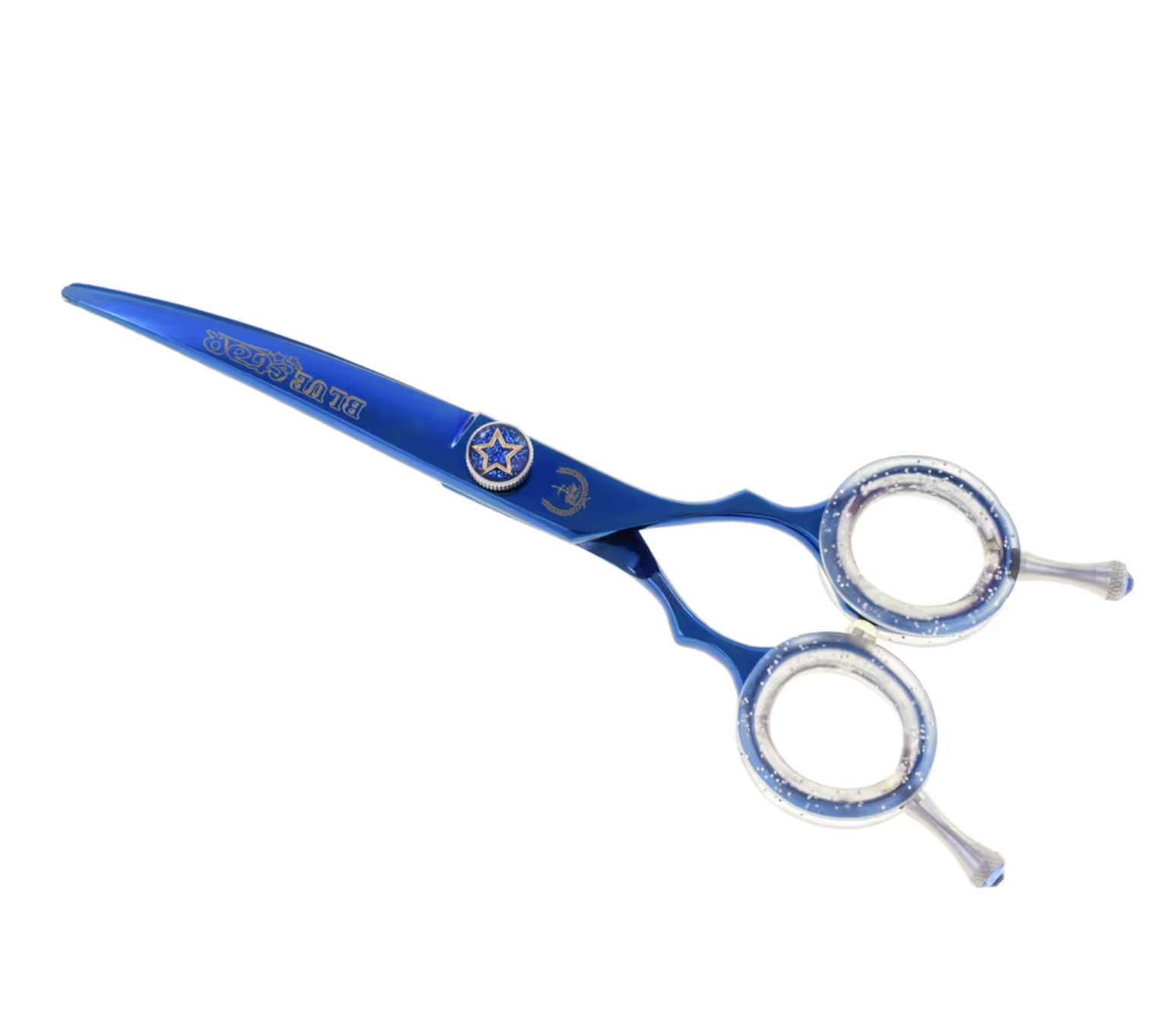 Visokokakovostne ukrivljene škarje za nego hišnih ljubljenčkov blagovne znamke Power & Working Scissors, model Blue Star, dolžine 6,0. Zasnovane so z ostrimi, delno izbočenimi rezili in simetričnim ročajem za udobno uporabo. Zagotavljajo gladko striženje in odličen končni rezultat. Primerne so za okroglo striženje, na primer gobčka, tačk ali repa. Uporabljajo jih znani vzreditelji in pasji frizerji ter razstavljavci po vsem svetu, namenjene so tako profesionalcem, kot tudi za domačo uporabo. Priložene so v originalnem etuiju z logotipom blagovne znamke.