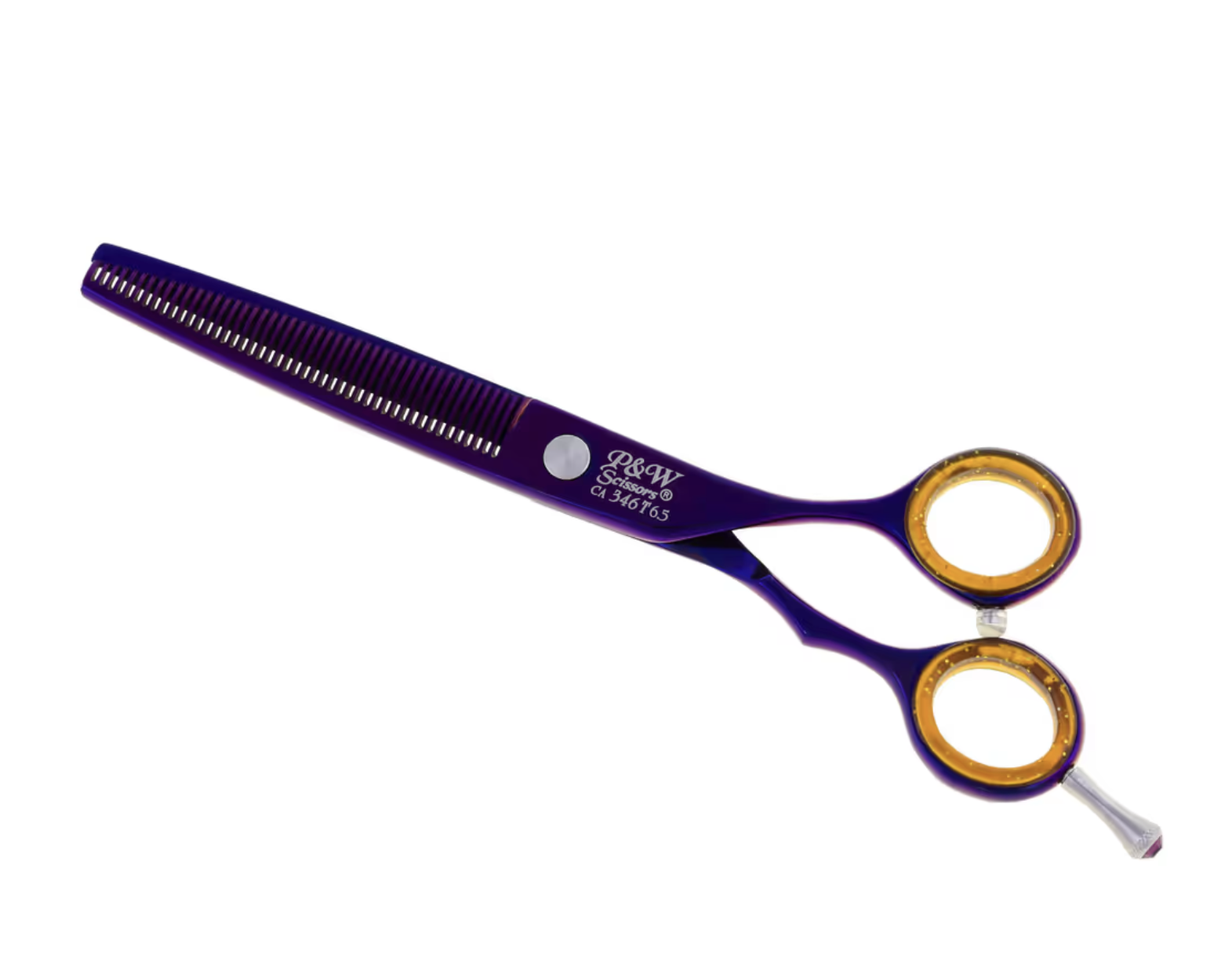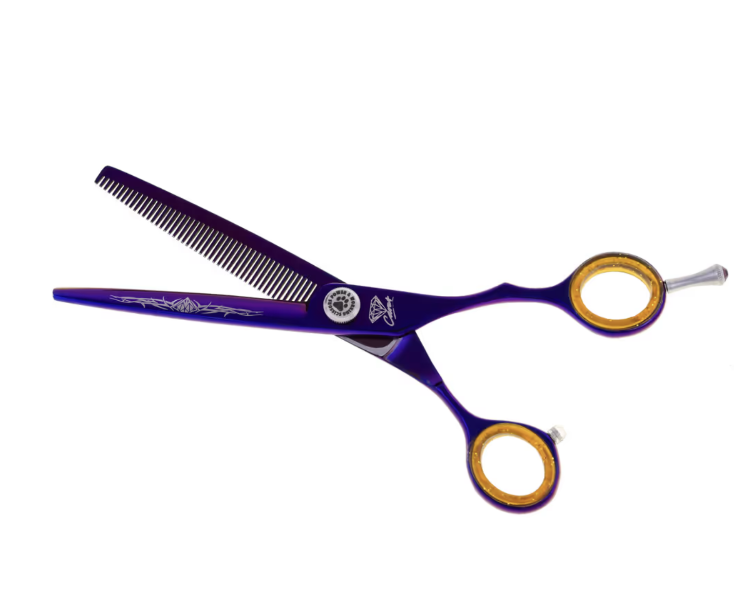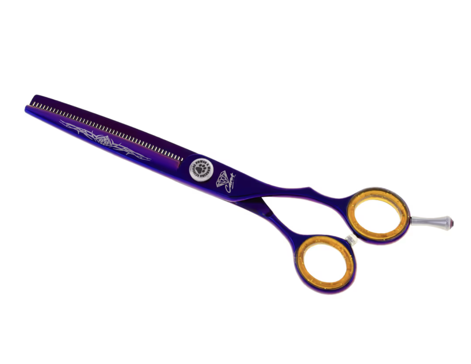 Profesionalne škarje za redčenje in oblikovanje dlake, enostranske, blagovne znamke Power & Working Scissors, model CARAT z 46 zobci dolžine 6,5. Uporabljajo jih znani vzreditelji in pasji frizerji ter razstavljavci po vsem svetu, namenjene so tako profesionalcem, kot tudi za domačo uporabo. Njihova ostra rezalna površina omogoča natančno in gladko redčenje ter oblikovanje dlake. Vsak zobec ima mikroskopsko brušeno površino, kar preprečuje zdrs dlake med striženjem. Pakirane so v etuiju z logotipom proizvajalca.