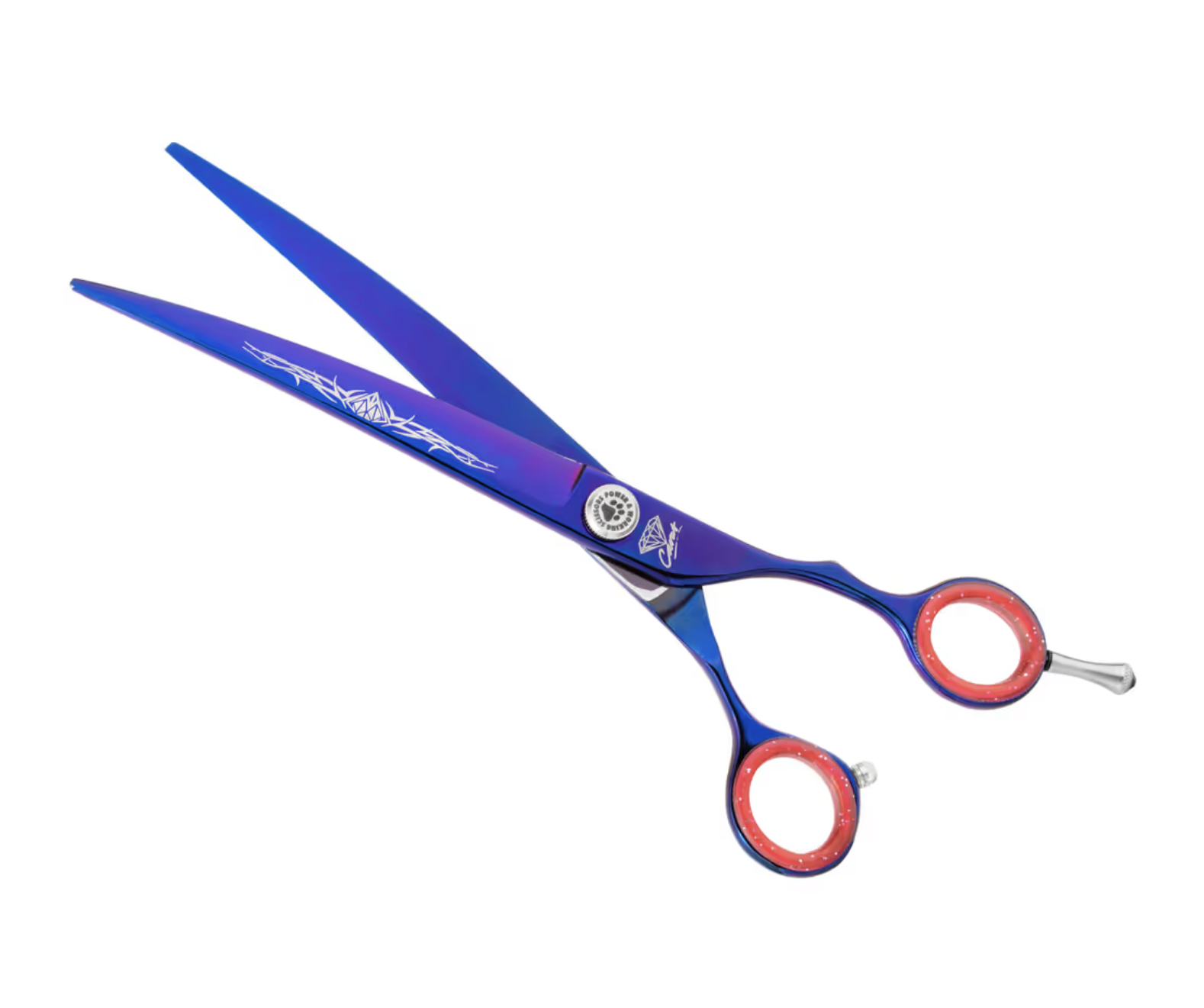 Visokokakovostne ukrivljene škarje za nego hišnih ljubljenčkov blagovne znamke Power & Working Scissors, model CARAT, dolžine 7,5. Zasnovane so z ostrimi, delno izbočenimi rezili in simetričnim ročajem za udobno uporabo. Zagotavljajo gladko striženje in odličen končni rezultat. Primerne so za okroglo striženje, na primer gobčka, tačk ali repa. Uporabljajo jih znani vzreditelji in pasji frizerji ter razstavljavci po vsem svetu, namenjene so tako profesionalcem, kot tudi za domačo uporabo.  Priložene so v originalnem etuiju z logotipom blagovne znamke.